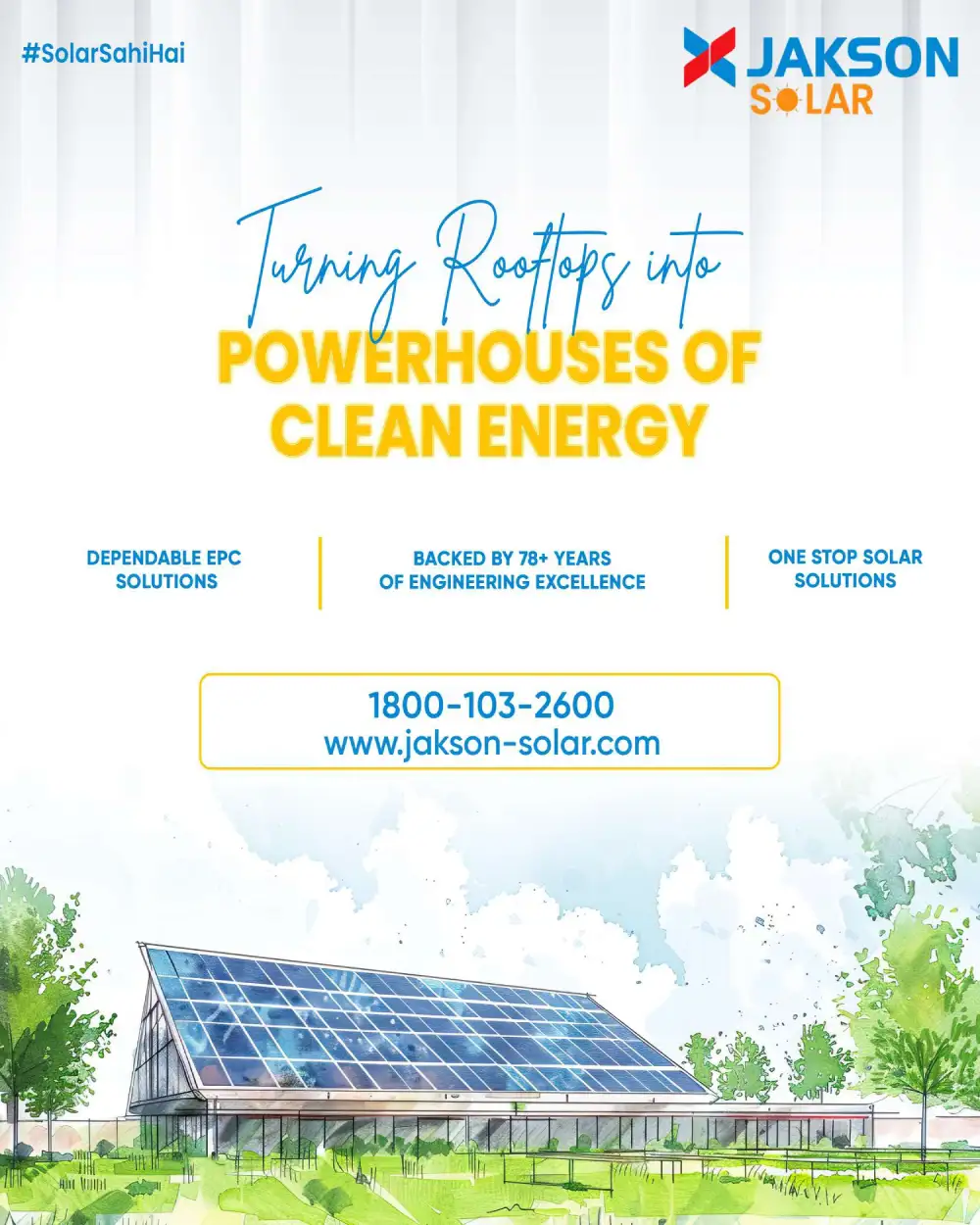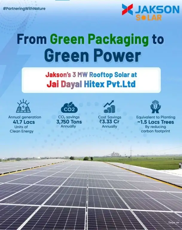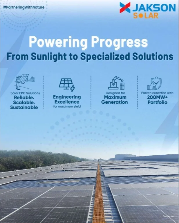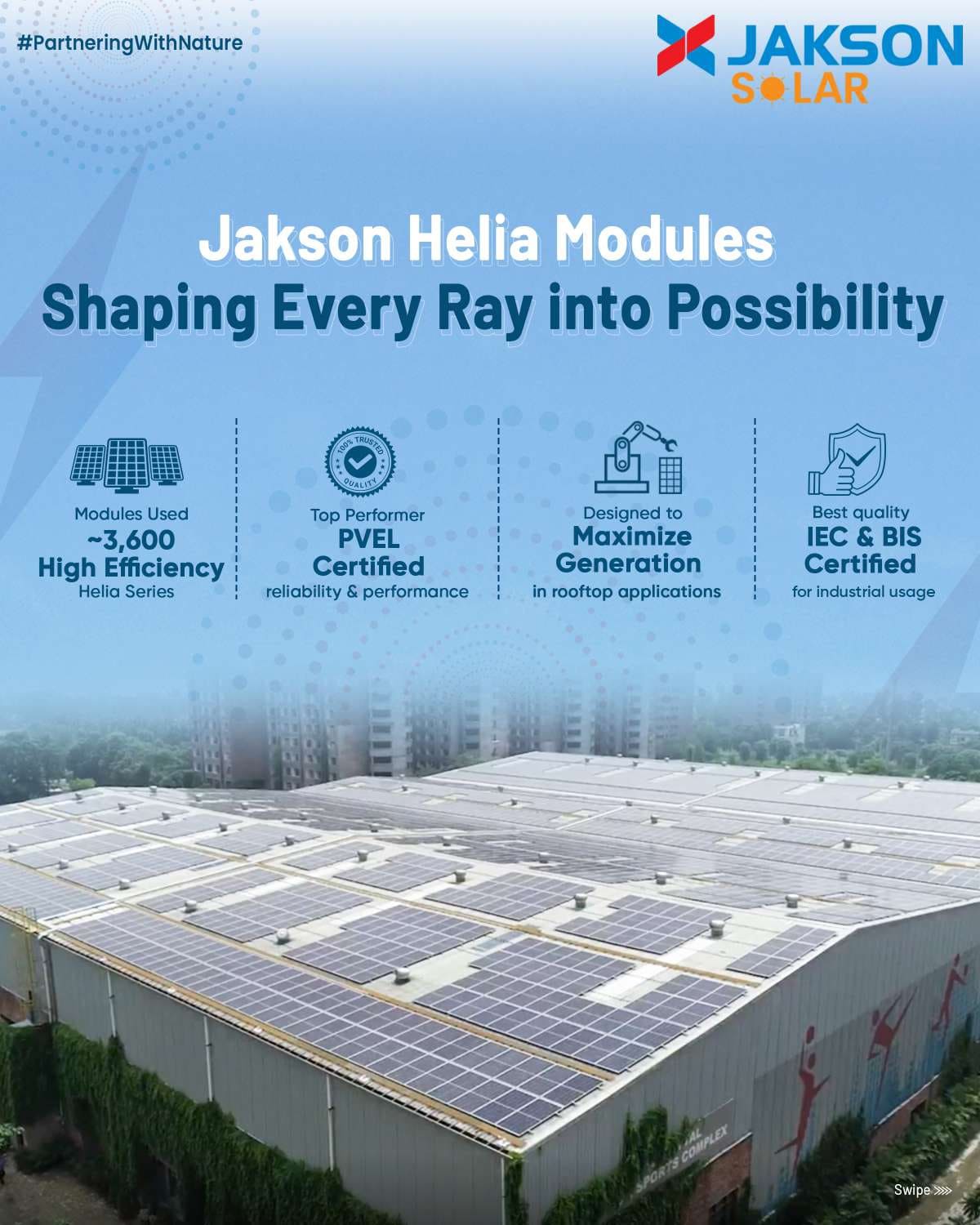 JAIDAYAL GROUP OF COMPANIES is turning its rooftop into a beacon of sustainability with Jakson’s 3 MW Solar Rooftop. This transition to green energy reflects a commitment to a cleaner, brighter future while harnessing cutting-edge solar technology. Backed by reliable, scalable, and sustainable Solar EPC solutions, engineering excellence for maximum yield, and a 200MW+ proven portfolio, Jakson is not just generating power-it’s powering progress from sunlight to specialized solutions.