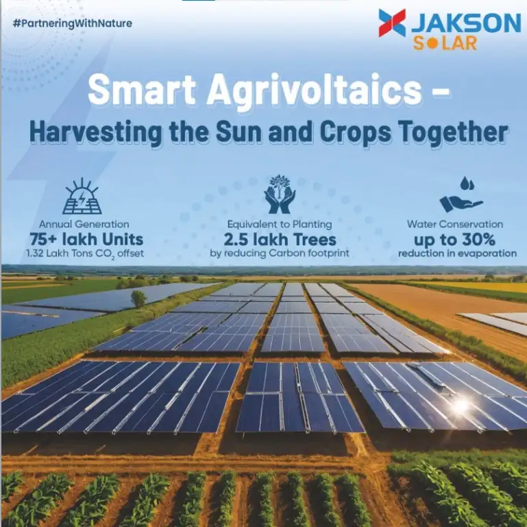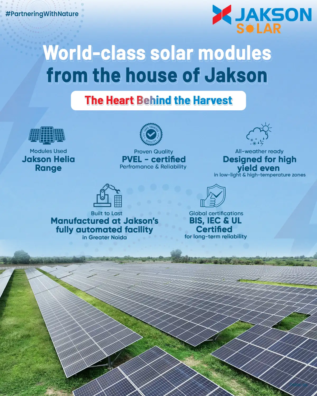 Powered by Jakson’s advanced 580 Wp TOPCon Glass-to-Glass modules, installation & commissioning done by Khare Energy Private Limited. This pioneering project generates over 75+ lakh units of green energy every year, while enhancing farm incomes and maximising land use efficiency.