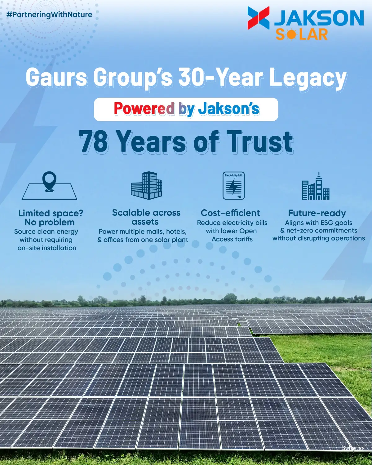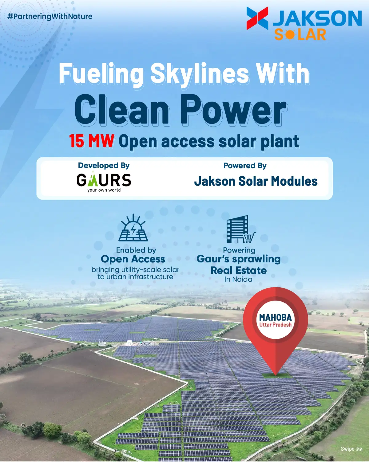 Jakson Solar is proud to be the module partner for the 15 MW Open Access solar project developed by Gaurs Group at Mahoba, Uttar Pradesh. With our high-efficiency Helia modules at the core, this off-site installation enables clean energy access for commercial infrastructure where on-site solar isn’t feasible. A 30-year legacy powered by 78 years of solar excellence that is built on trust, performance, and purpose.