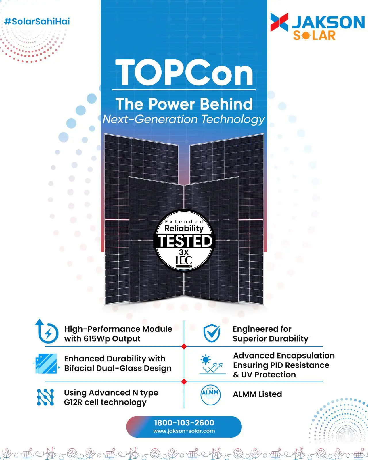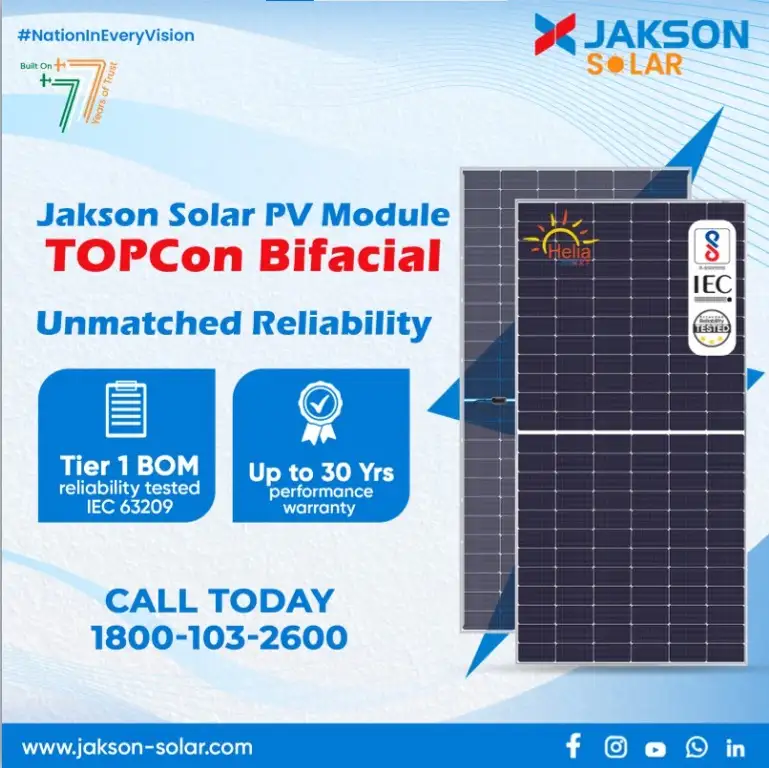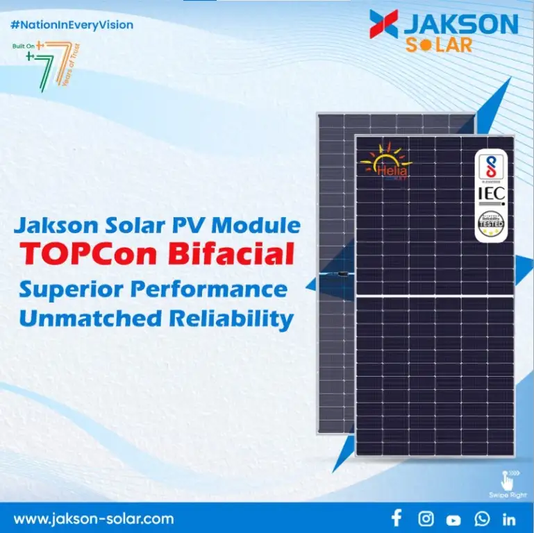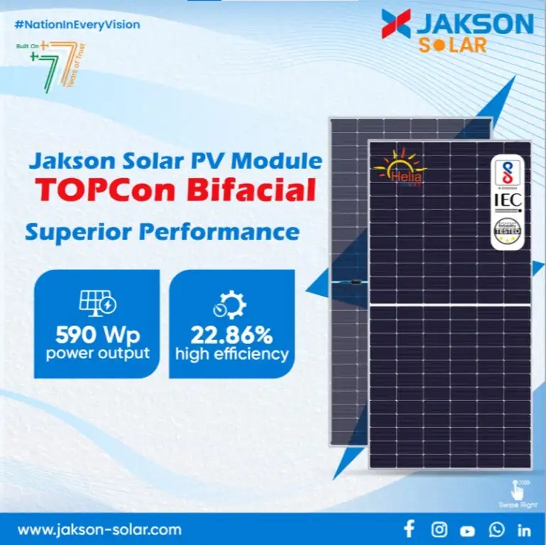 Jakson Solar’s Next-Gen Bifacial TOPCon Module – the perfect blend of efficiency, reliability, and savings! With cutting-edge technology and superior manufacturing, our modules ensure maximum energy generation and long-term performance. Choose Jakson Solar for a dependable, high-quality renewable energy solution that guarantees higher returns on investment. Make the right choice for sustainability and savings. Power your future with the best in solar innovation!