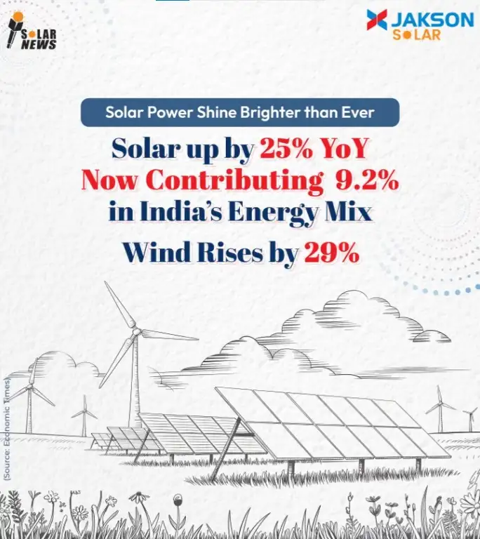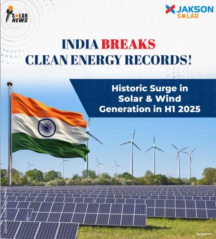 Industry News India has achieved a historic milestone in clean energy, with solar and wind generation breaking records in the first half of 2025. This growth has significantly reduced fossil fuel dependence, cutting nearly 24 million tonnes of CO₂ in just six months. At Jakson Solar, we are proud to power this transformation through advanced solar manufacturing and future-ready renewable solutions for a sustainable India.