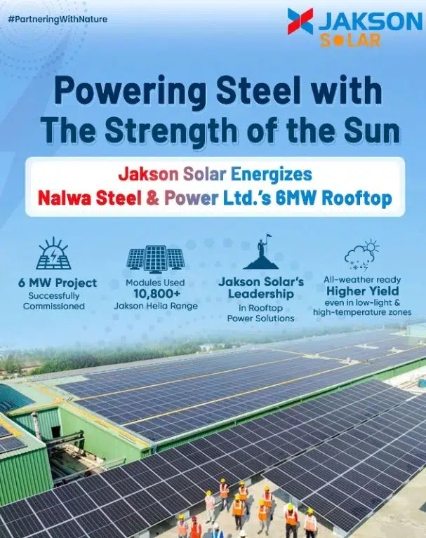 A milestone in clean energy transition! Jakson Solar has successfully commissioned a 6MW rooftop solar solution at NALWA STEEL AND POWER LIMITED. Designed to perform in all-weather conditions, this system ensures higher output, reduced CO₂ emissions, and long-term cost savings. With 78+ years of engineering excellence, we continue to empower industries with dependable solar solutions.