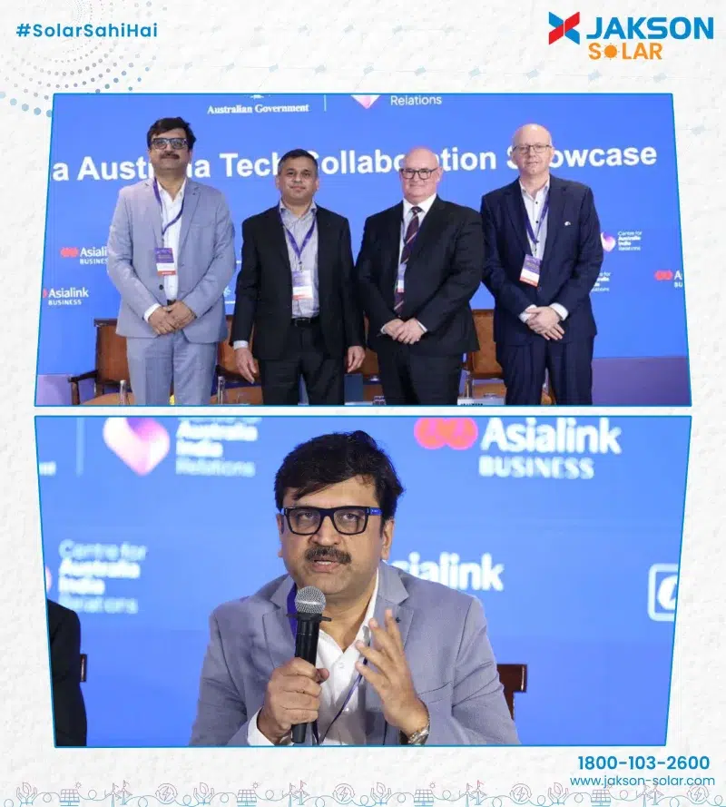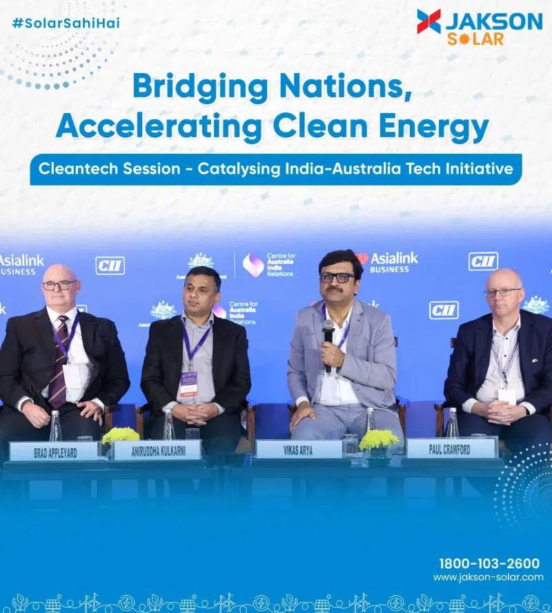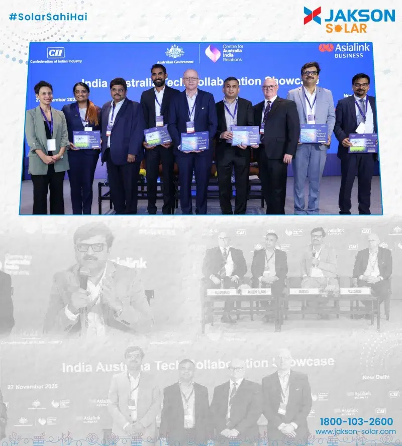 Mr. Vikas Arya, Jakson Solar moderated the Cleantech Session at the India-Australia Tech Collaboration Showcase in New Delhi, engaging with leading innovators to discuss the future of clean energy cooperation. The session highlighted advanced Australian technologies supporting India’s ambition of achieving 500 GW of renewable energy by 2030, including scalable hydrogen generation solutions, efficient vanadium redox flow battery storage, and aerial robotics that accelerate and enhance transmission line deployment.