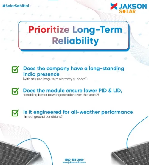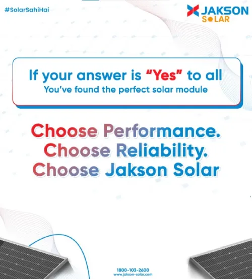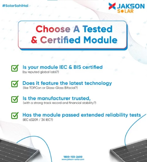 At Jakson Solar, we believe choosing the perfect Solar module begins with clarity and confidence. A reliable module should demonstrate proven performance, consistent output, and strong durability across varying conditions. It’s essential to evaluate the manufacturer’s experience, quality systems, and long-term service commitment. When your module is built on Trust, Advanced engineering, and Robust validation, your solar project is built for the future. Make every watt count by choosing a partner who prioritises excellence.
