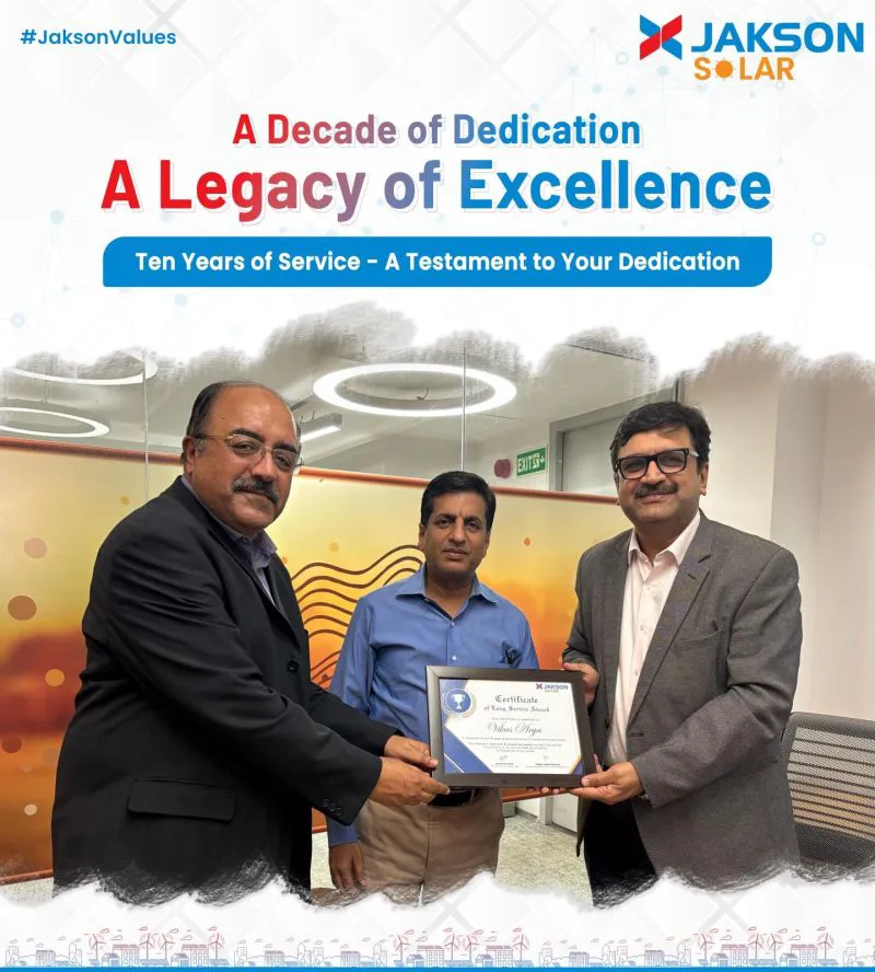 Celebrating a remarkable milestone at Jakson! Mr. Vikas Arya has completed 11 years of dedicated service, a true testament to his Commitment, Leadership, & Unwavering passion for excellence. Over the past decade, he has played a pivotal role in driving growth, strengthening collaboration, and inspiring teams with his vision and integrity. His journey reflects the values we stand for – consistency, innovation, and continuous impact. Here’s to a decade of excellence and many more years of success ahead.