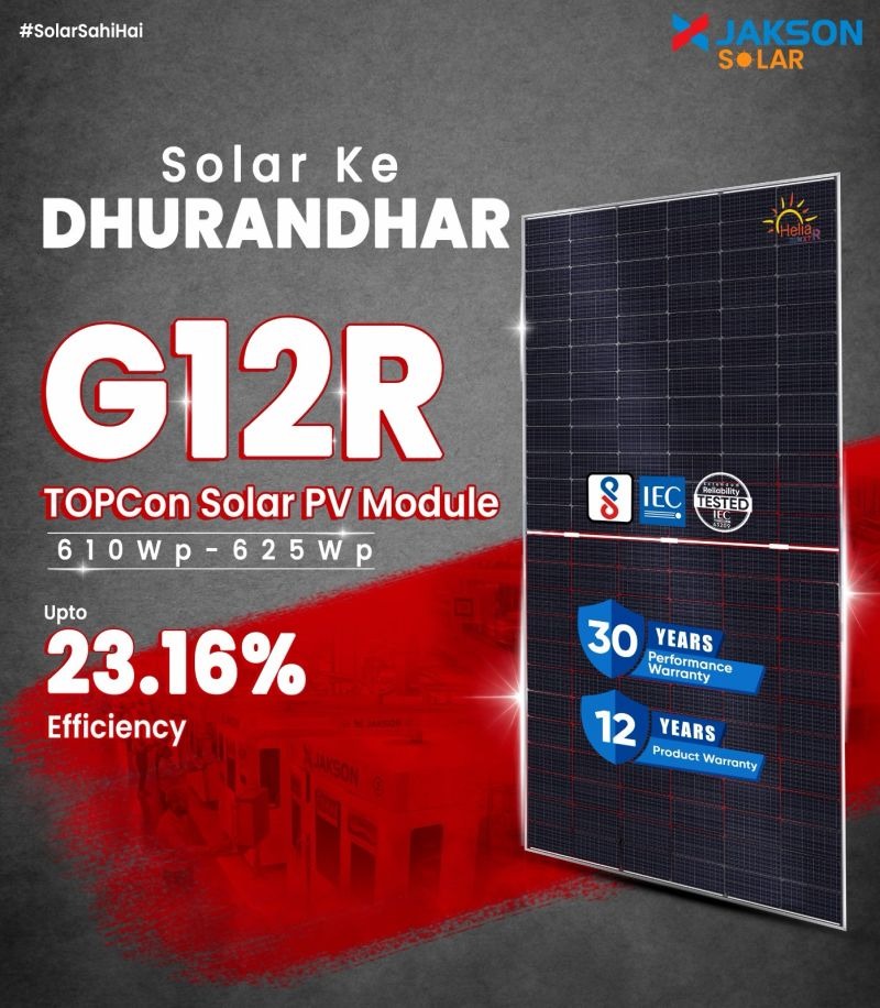Powering the next generation of solar technology, Jakson Solar’s G12R Module represents a leap forward in Performance, Reliability, and Innovation. Delivering up to 615 Wp power, the G12R stands at the forefront of advanced solar engineering. ALMM-empanelled, IEC-certified, and rigorously reliability-tested, it ensures long-lasting performance even in demanding environments. Designed for a cleaner, smarter, and more sustainable tomorrow, the G12R is redefining the future of solar energy.
